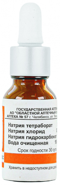 Натрия тетраборат 0,1+натрия гидрокарбонат 0,1+натрия хлорид 0,05+вода очищ 10,0 р-р фл N1x1 Межбольничная ап Россия