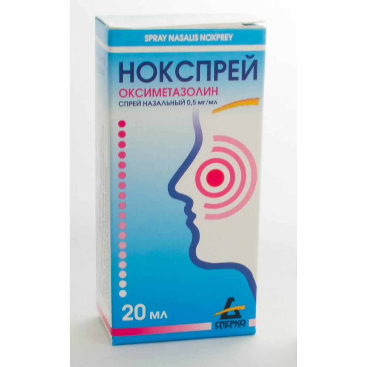 Фармакологическое действие: Оксиметазолин (3-[(4,5-дигидро-1-Н-имидазол-2-ил)метил]-6-(1,1-диметил)-2,4-диметил-моногидрохлорид) относится к сосудосуживающим средствам для местного применения в оториноларингологии. При введении в полость носа он вызывает сужение артериол слизистой оболочки полости носа, вследствие чего уменьшает ее отек, гиперемию, экссудацию, восстанавливает носовое дыхание, уменьшает выраженность ринореи. Применение Нокспрея уменьшает отечность слизистой оболочки вокруг устьев евстахиевых труб, улучшая дренаж при евстахиите и среднем отите. Эфирные масла, входящие в состав препарата, способствуют устранению чувства раздражения слизистой оболочки полости носа, защищают ее от чрезмерного высыхания. Локальное сужение сосудов слизистой оболочки полости носа и околоносовых пазух развивается через 5–10 мин после впрыскивания Нокспрея и длится 10–12 ч.