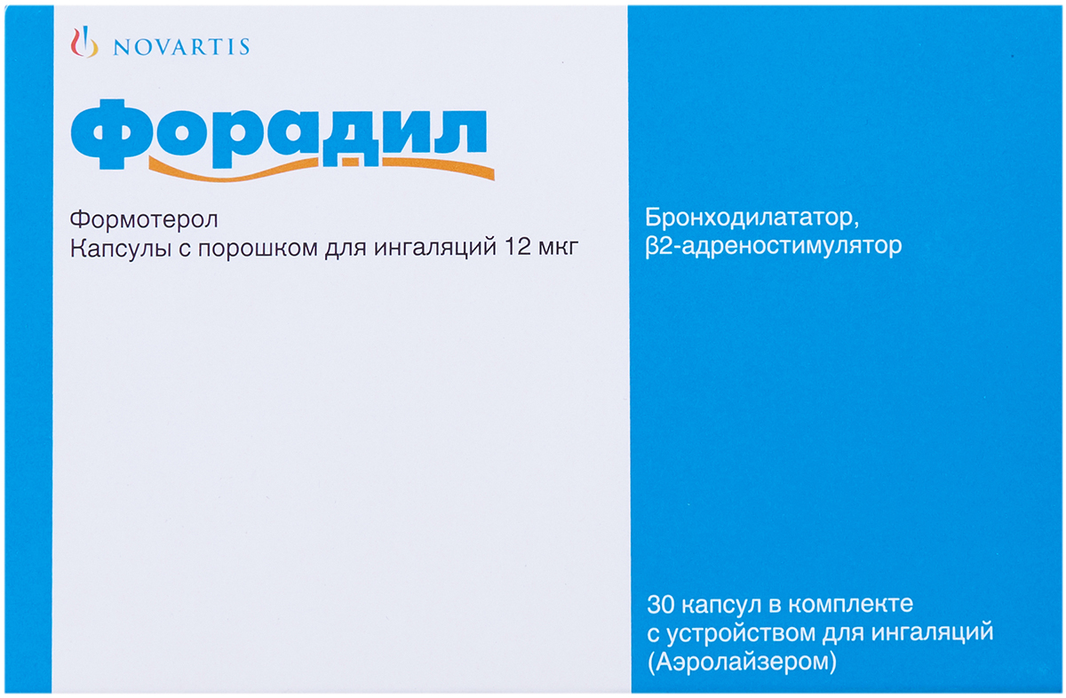 Препарат выпускается в виде прозрачных бесцветных капсул с порошком для ингаляций, в виде аэрозоля для ингаляций. Одна капсула Форадила содержит 12 мкг формотерола фумарата (в упаковке 30 капсул).